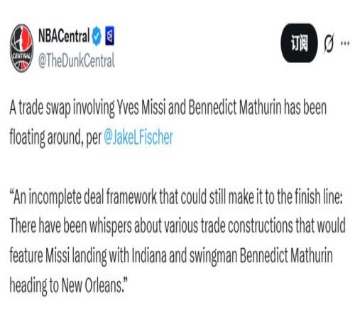 北京時間1月23日,據名記Fischer報道,印第安納步行者隊與新奧爾良鵜鶘隊已就多套交易方案展開探討,核心框架為將步行者隊效力第四個賽季的后衛本內迪克特-馬瑟林送至新奧爾良,同時換來鵜鶘隊二年級中鋒伊夫斯-米西。